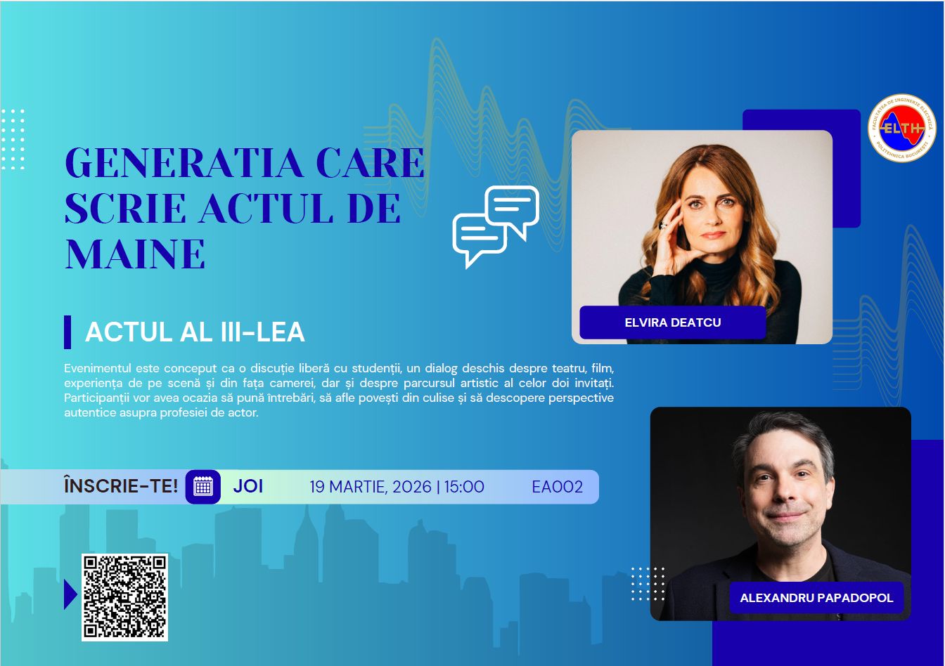 Vă așteptăm, într-un număr cât mai mare, joi 19 martie 2026, ora 15:00 în amfiteatrul EA002 din cadrul Facultății de Inginerie Electrică.